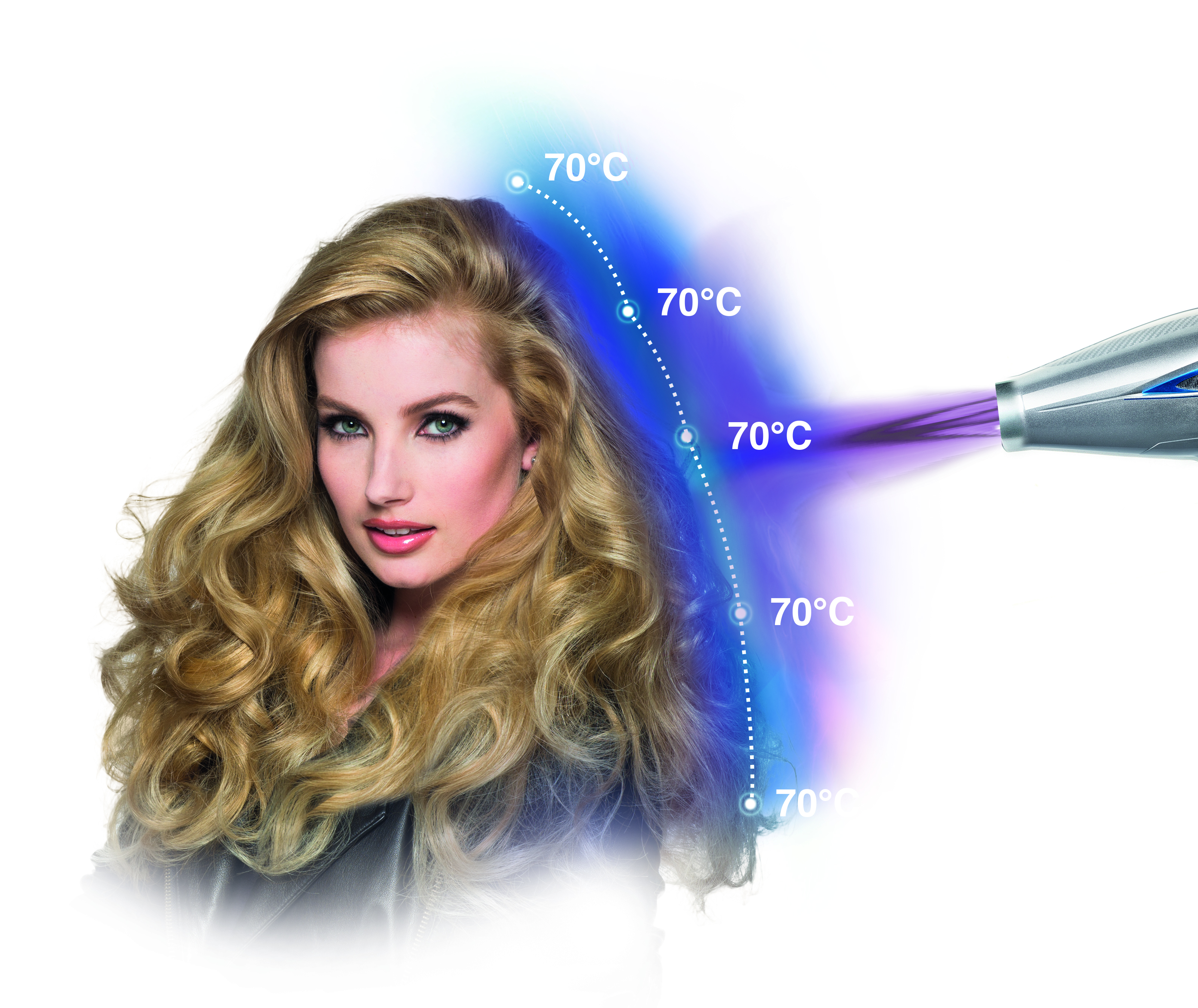 Температура 70°C обеспечивает оптимальное время сушки и защиту волос, отлично подходит для поврежденных и ослабленных волос